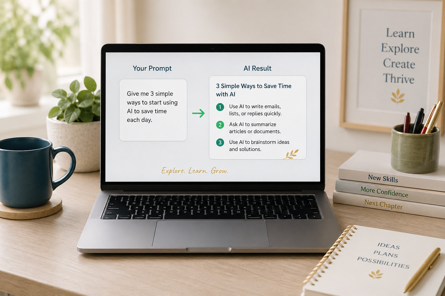 Type: “Give me 3 simple ways to save time using AI” and see what you get.